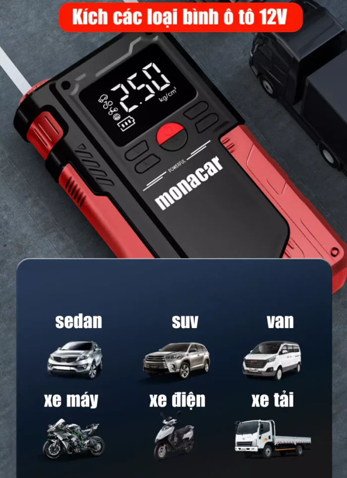 * Đặc tính sản phẩm: Kích bình ô tô 12v, bơm lốp đa năng 4in1 monacar